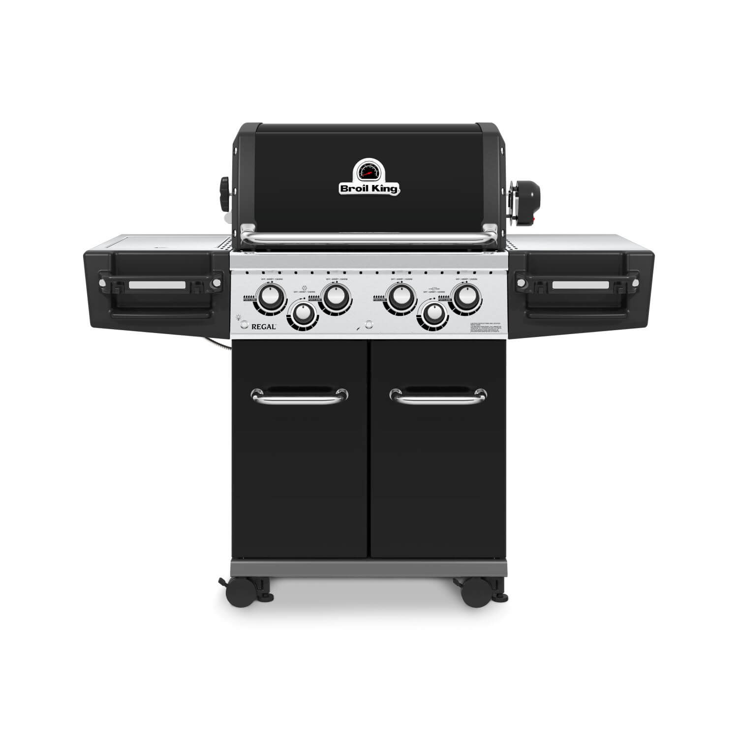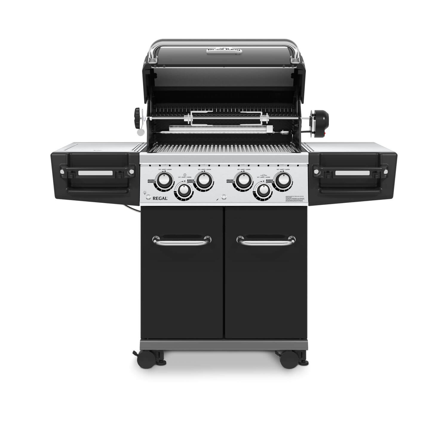 The Regal 490 features 4,486 sq. cm. total cooking space including porcelain coated warming rack, heavy duty cast iron cooking grids, stainless steel Flav-R-Wave cooking system, 4 stainless steel Dual-Tube burners, stainless steel side shelves, and an enclosed cabinet base with black powder coat cabinet doors.